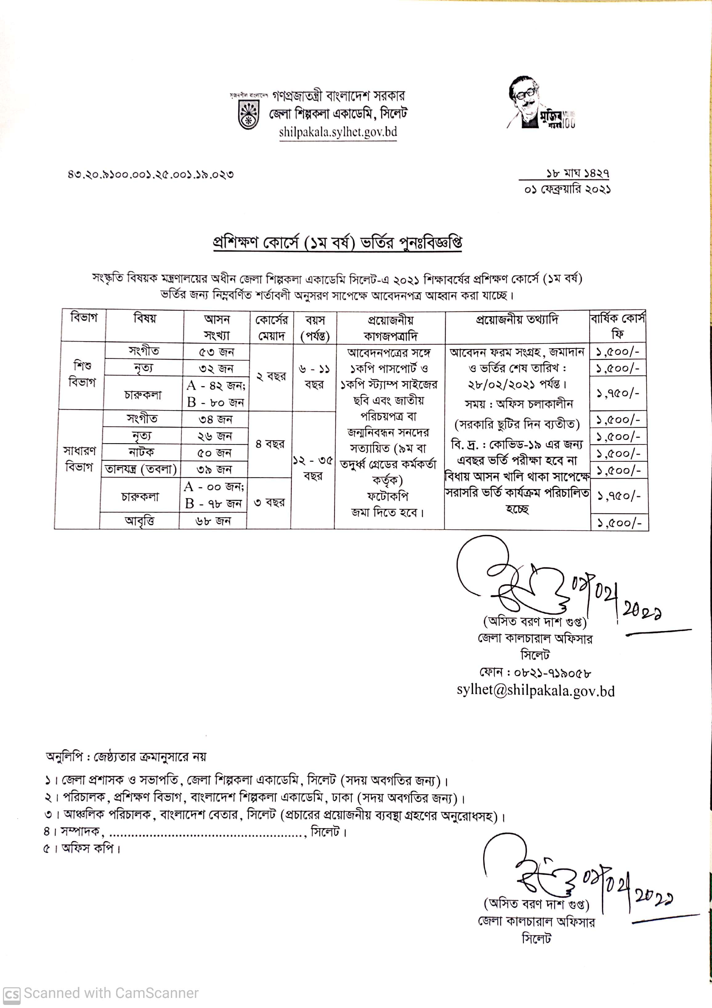 জেলা শিল্পকলা একাডেমি সিলেটে প্রশিক্ষণ কোর্স ২০২২-এর ভর্তি বিজ্ঞপ্তি